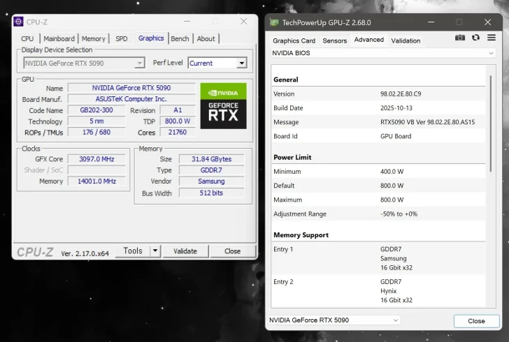 ▲ 800W BIOS,电压 +100%,核心超频 +200,显存超频 +3000鉴于 RTX 5090 与 RTX 4090 的 16-pin 电源接口曾出现负载风险,这种更高功率的设定可能使接口承受更大的压力。另外,跨品牌刷写 BIOS 存在较高风险,可能导致显卡异常或损坏,因此不建议从未接触过此类操作的用户贸然尝试。
